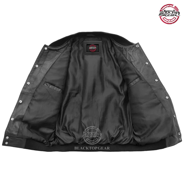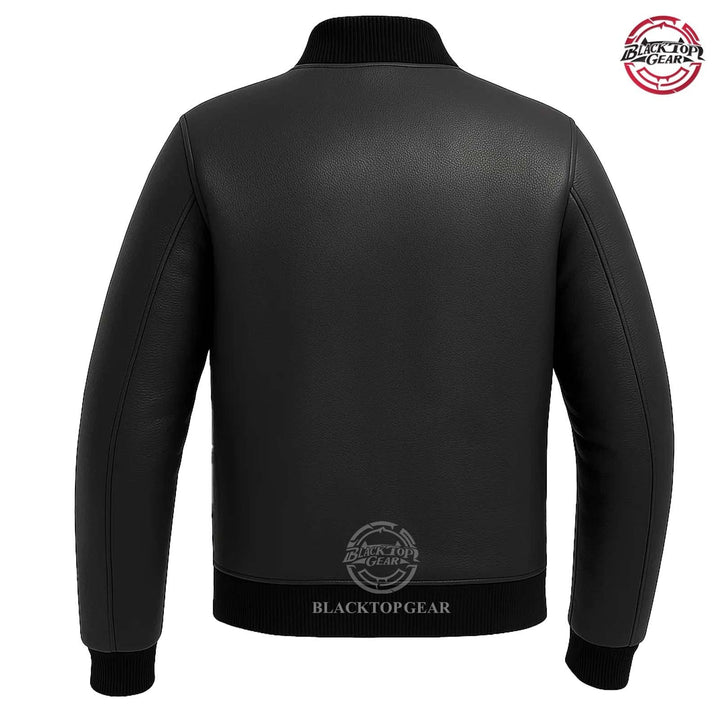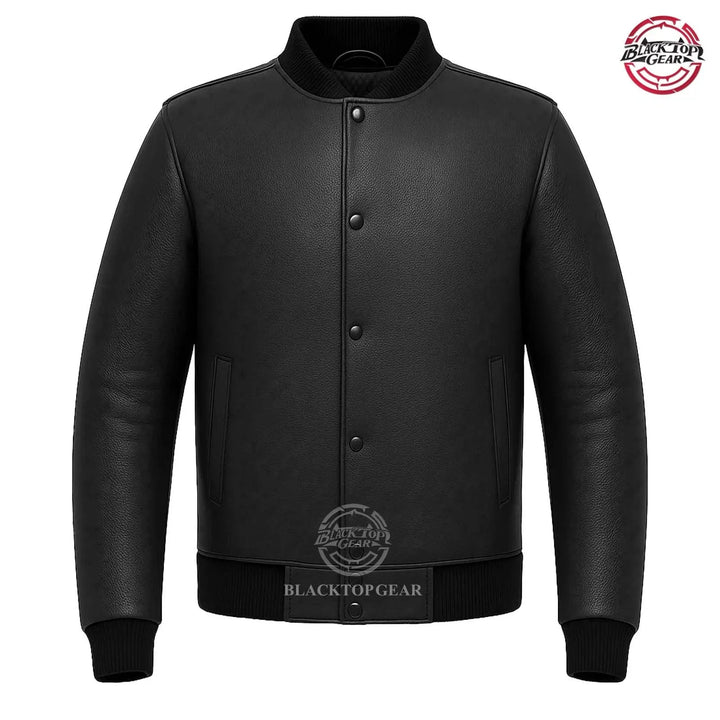Upgrade your winter wardrobe with this premium Men's Black Leather Varsity Bomber Jacket. Crafted from 100% genuine cowhide leather, this jacket offers durability, comfort, and timeless style. Its minimalist design is complemented by a soft inner lining, ribbed cuffs and hem, and a snap-button closure for added warmth. Perfect for casual wear, outdoor adventures, or layering up in cold weather, this versatile piece is a must-have for every modern man.