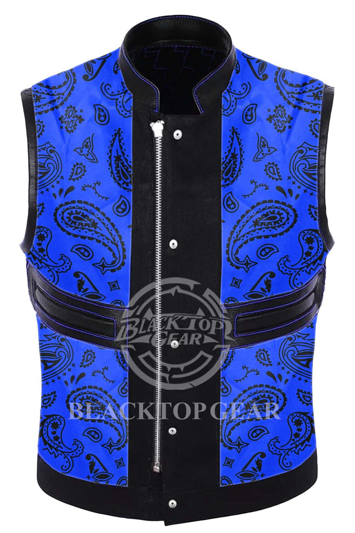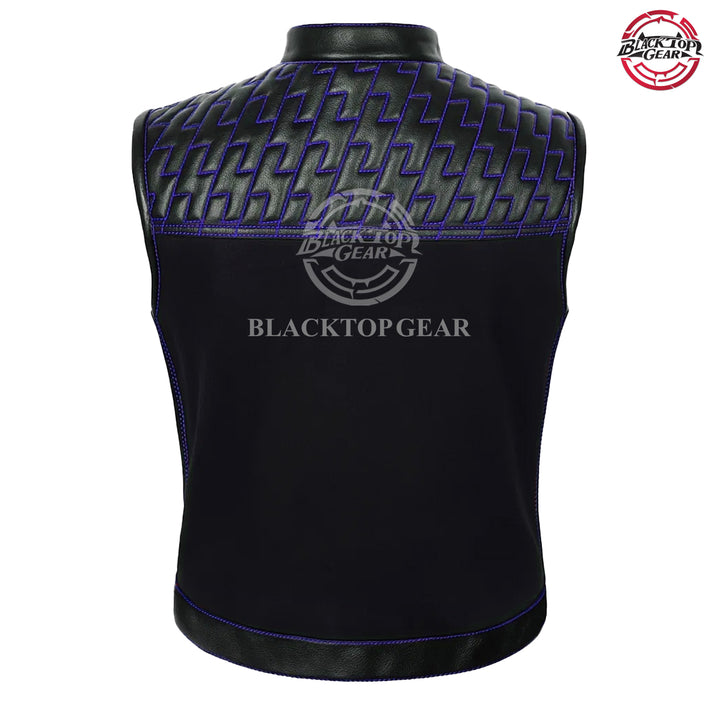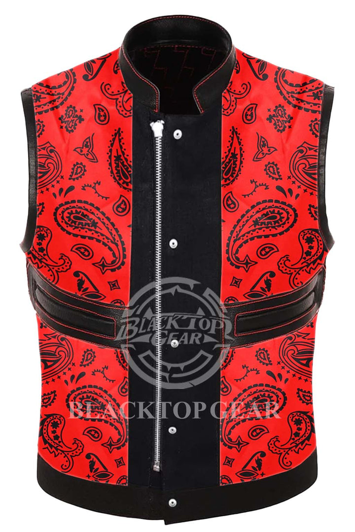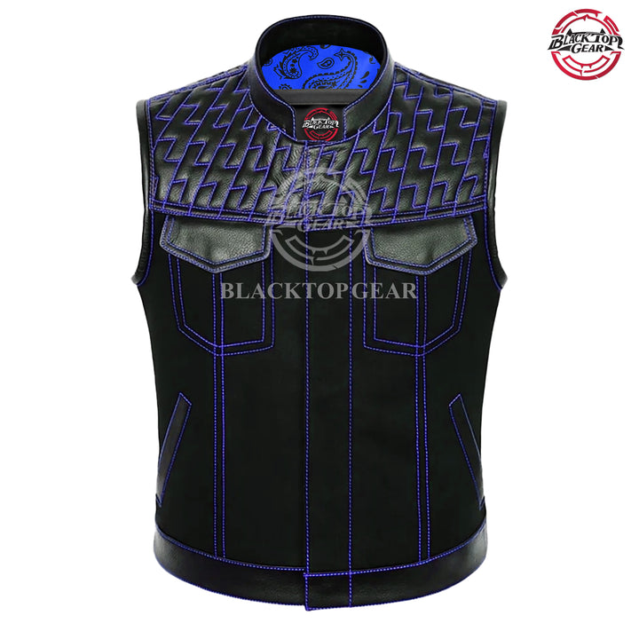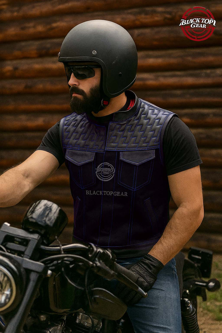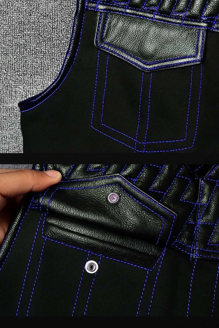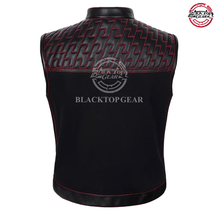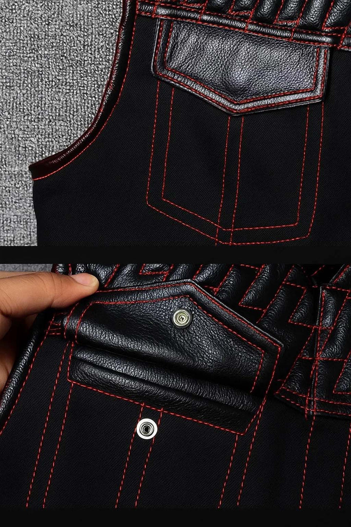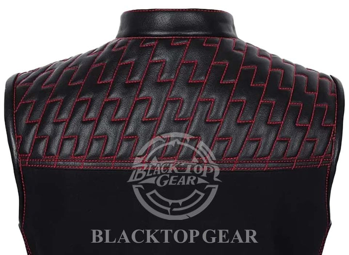 Step up your biker style with this premium Club Style Men's Leather & Denim Patchwork Motorcycle Vest from Blacktop Gear. Crafted with high-quality cowhide leather and durable black denim, this sleeveless vest features bold red contrast stitching, quilted leather shoulders, and a classic mandarin collar for an aggressive, stylish look.