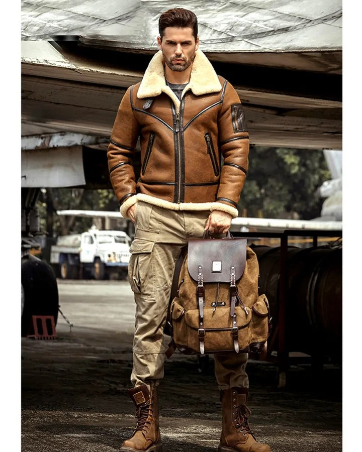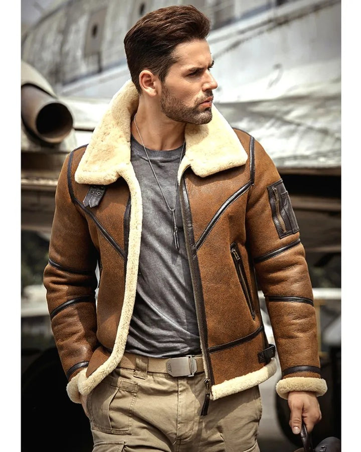 men’s shearling leather jacket, brown aviator jacket, winter biker jacket, pilot bomber jacket, shearling-lined leather coat, men’s vintage leather jacket