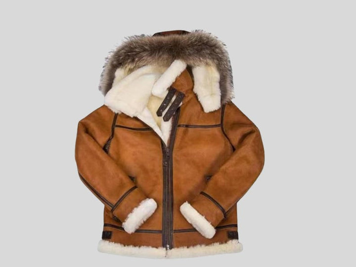 Functional Hood Design: Features an attached shearling hood generously trimmed with dark brown/natural raccoon or fox fur (or high-quality faux fur), offering maximum protection and a distinctive, rugged look.