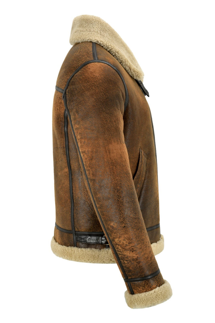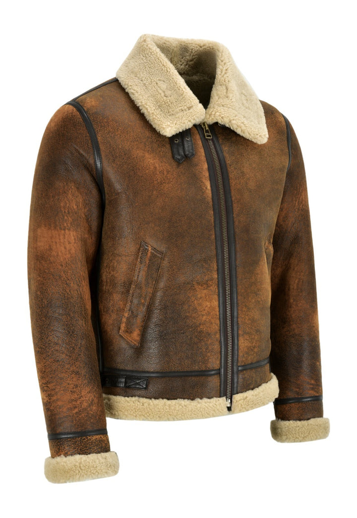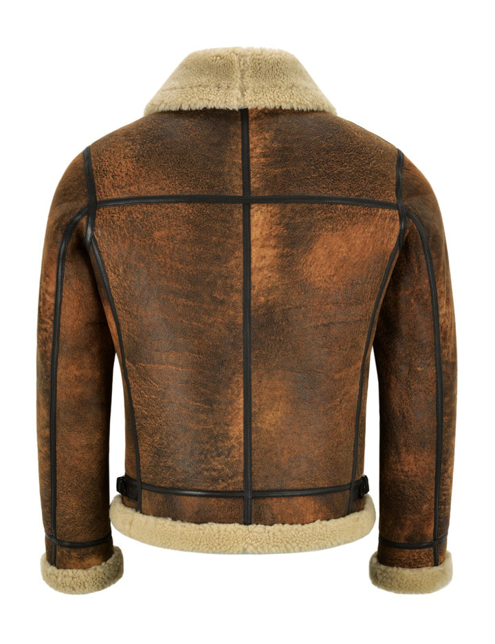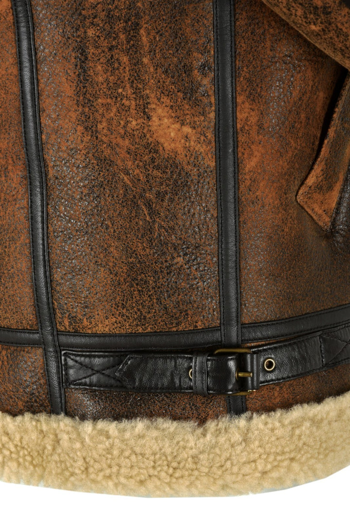 This lovely B3 jacket is genuine 100% full Sheepskin Leather, On the Outside of the jacket it is a beautiful leather finish, and on the inside there is a very smooth, supple and warm thick sheepskin wool of ivory color and 100% Natural, The jacket has two hand warmer slanted pockets, it also has a straps and buckles on the collar & Two side straps for fitting adjustment, All Seams have been reinforced, The zip is heavy duty.