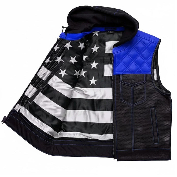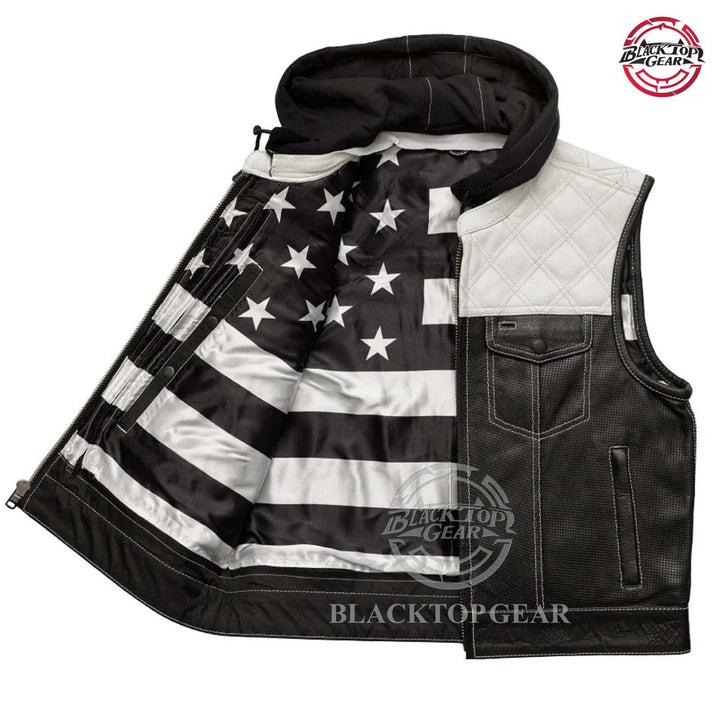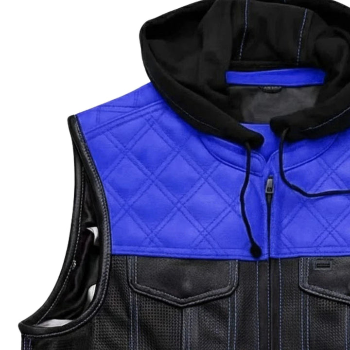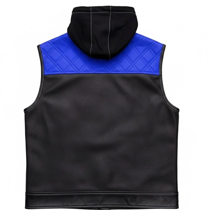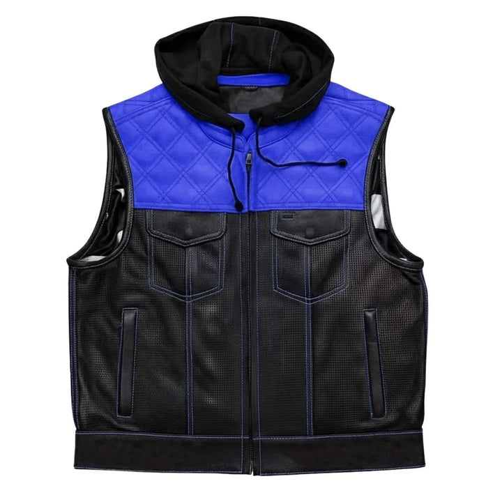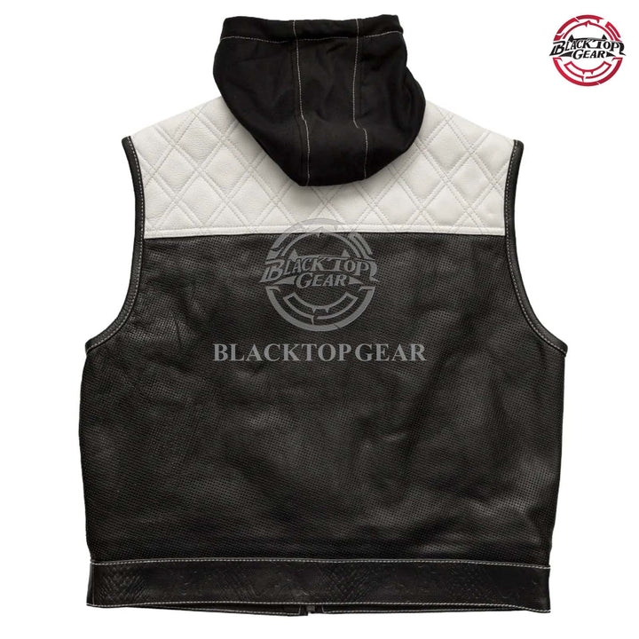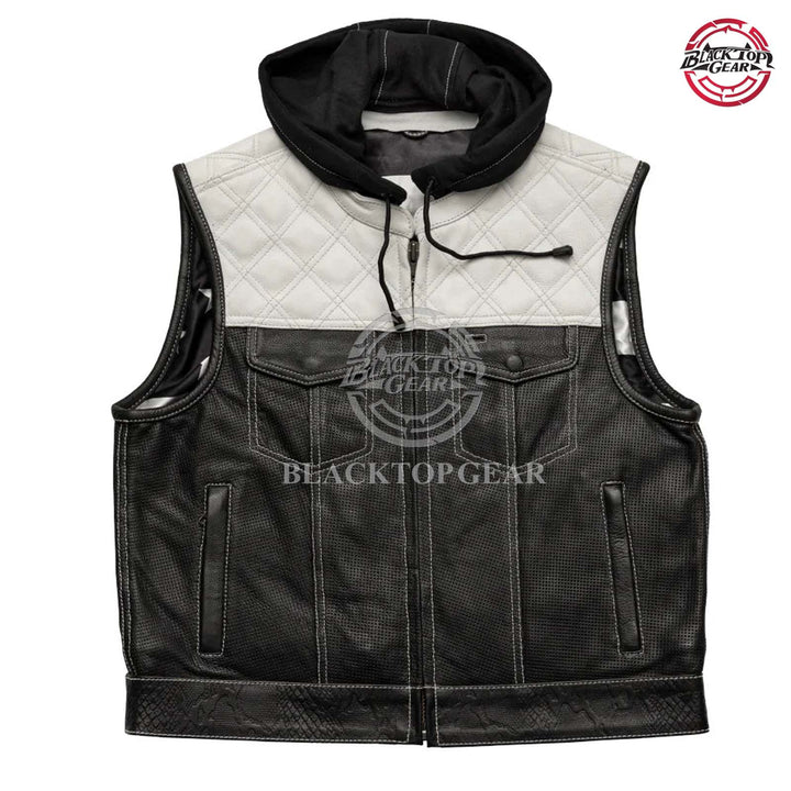 Upgrade your ride with this bold men’s motorcycle leather vest featuring a detachable red hoodie. Crafted with premium perforated black leather, red diamond-stitched shoulders, and reinforced seams, this club-style vest delivers a rugged look and breathable comfort. Dual chest and hand pockets add function and flair. Ideal for bikers, MC clubs, and streetwear style. Perfect for motorcycle riding, casual wear, or layering over hoodies and shirts. Stand out in style with Blacktop Gear’s signature riding vest.