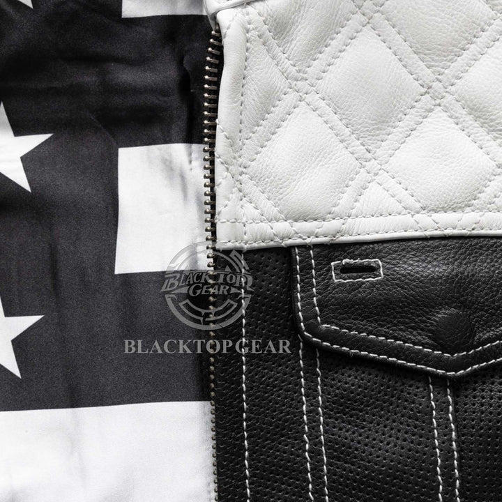 - Club style biker vest with black and white stitch