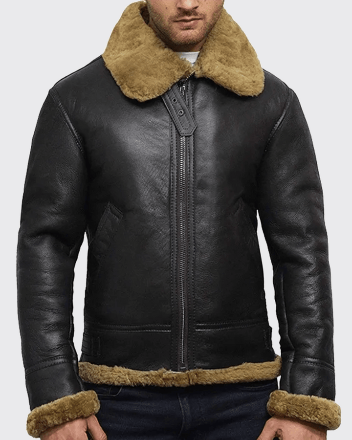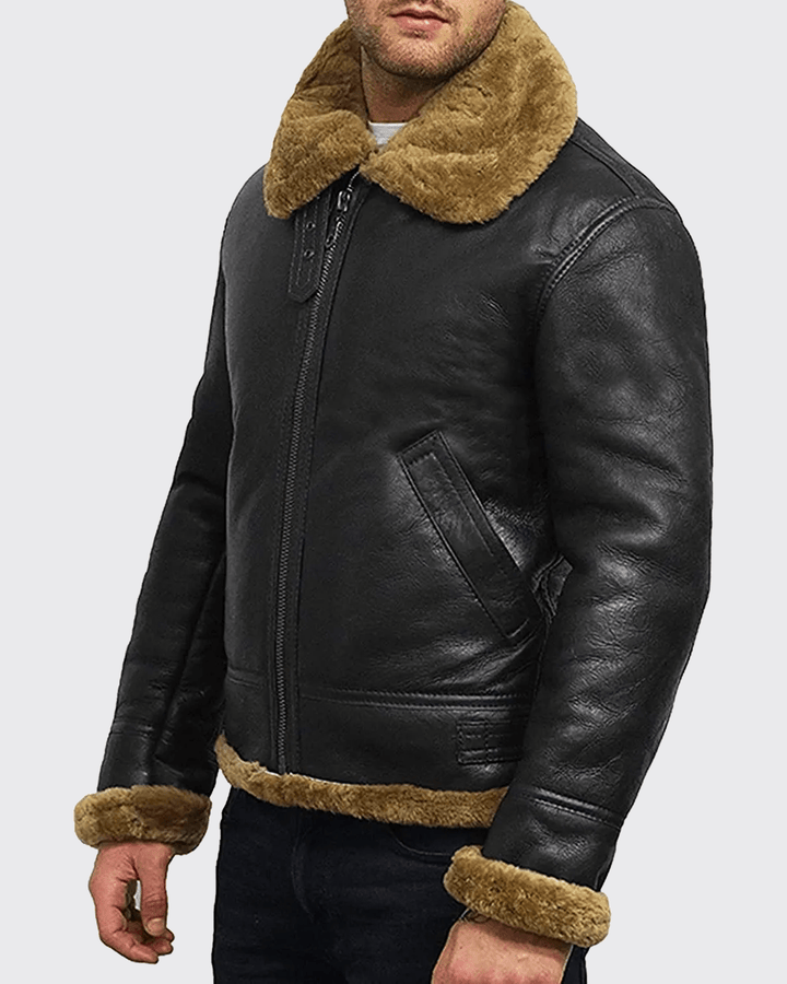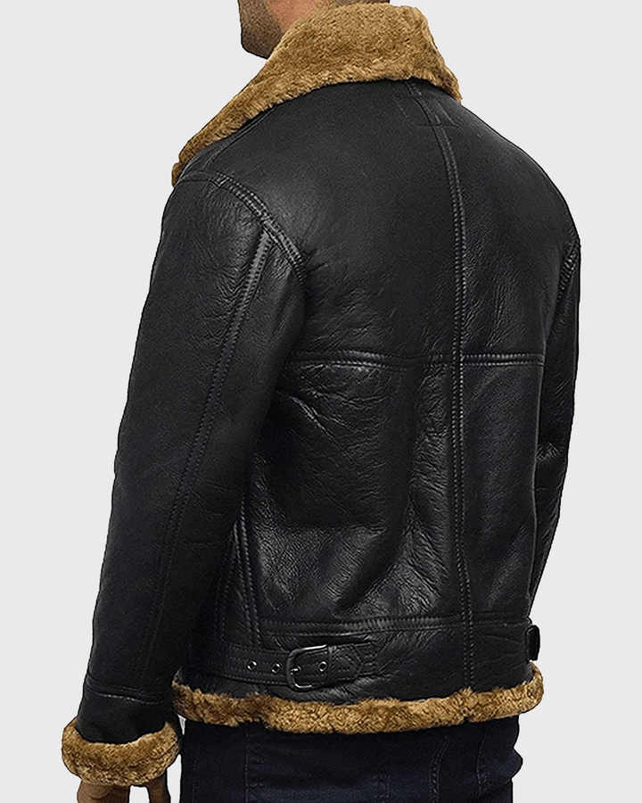 Men’s Black Shearling Leather Jacket – Winter Aviator Style with Fur Collar