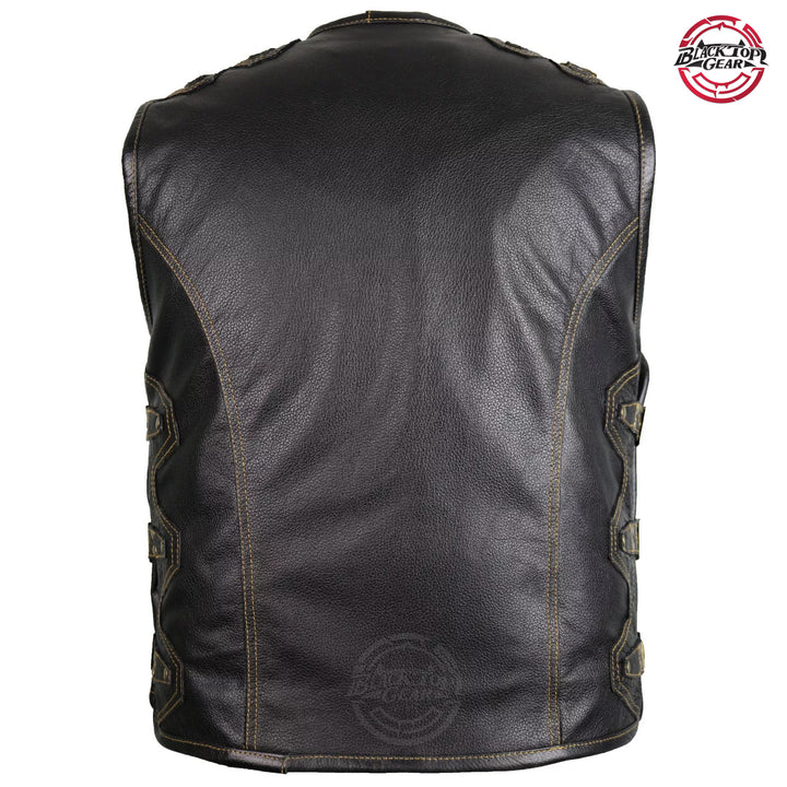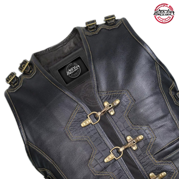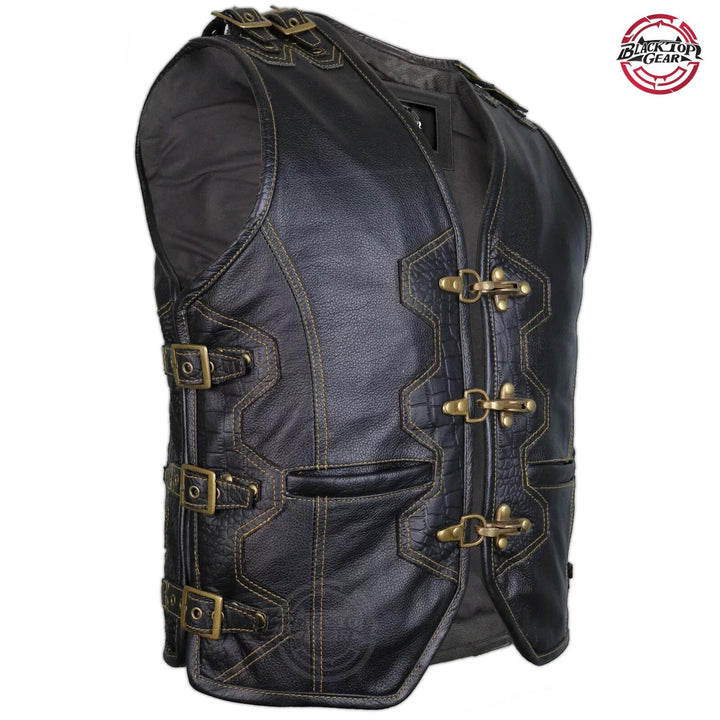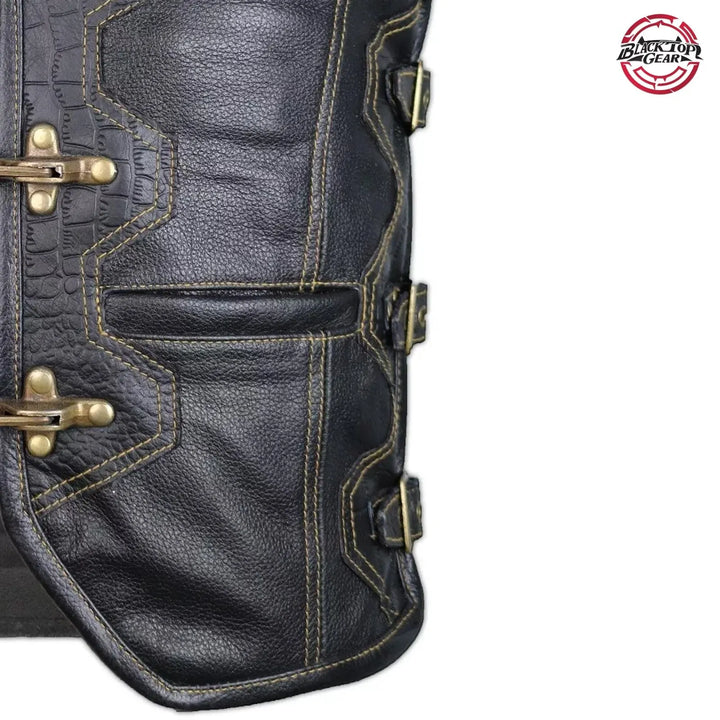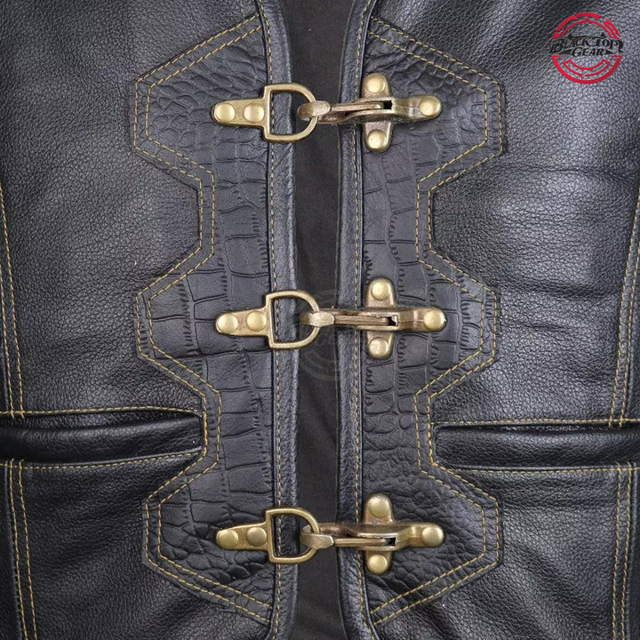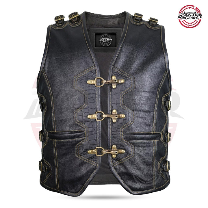 Elevate your biker style with this Men's Genuine Cowhide Full Grain Leather Vest. Crafted from high-quality black full-grain leather, this waistcoat combines durability with a rugged rocker aesthetic. Its laced sides are adjustable, offering up to 5 cm of expansion on each side for a perfect fit. Leather cords enhance the vest's detailing, while the adjustable 3-buckle design ensures a secure, customizable fit. Featuring three chrome carbine clasps and two convenient zippered outer pockets, this vest is as practical as it is stylish. With no middle back suture, it provides a smooth, uninterrupted finish for ultimate comfort and a sleek look