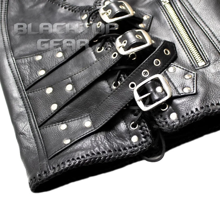 Elevate your biker style with this Men's Genuine Cowhide Full Grain Leather Vest. Crafted from high-quality black full-grain leather, this waistcoat combines durability with a rugged rocker aesthetic. Its laced sides are adjustable, offering up to 5 cm of expansion on each side for a perfect fit. Leather cords enhance the vest's detailing, while the adjustable 3-buckle design ensures a secure, customizable fit. Featuring three chrome carbine clasps and two convenient zippered outer pockets, this vest is as practical as it is stylish. With no middle back suture, it provides a smooth, uninterrupted finish for ultimate comfort and a sleek look