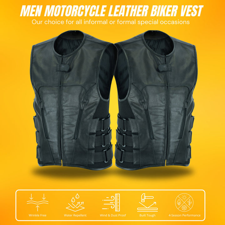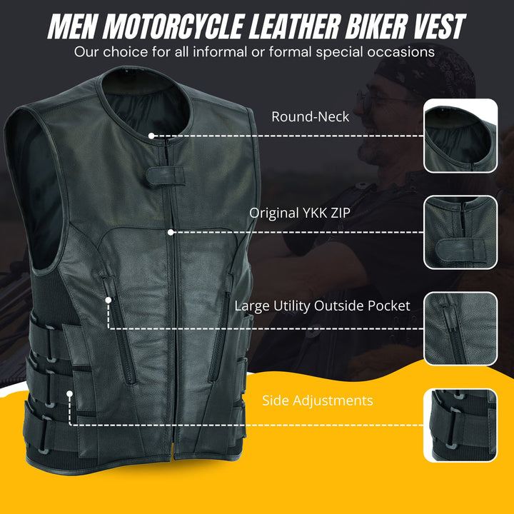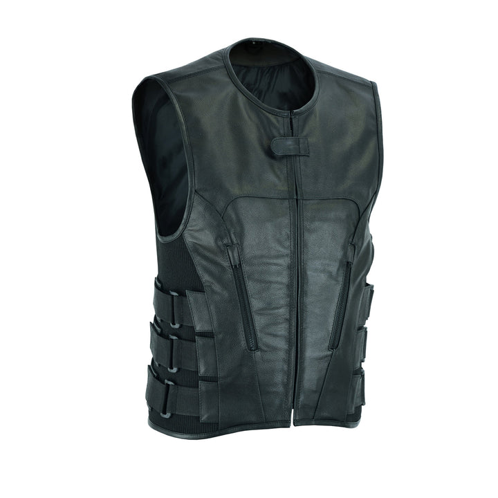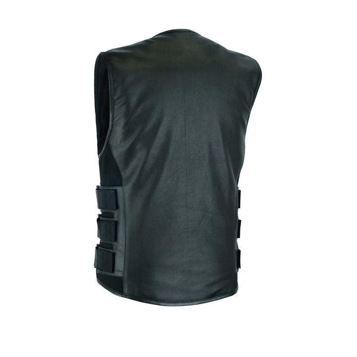 Blacktop Gear Men's Leather Cross Stitch Club Style Vest The Commando is a swat team style vest. It's got nylon side straps over adjustable side panels making it easy to adjust to fit you properly. The mesh lining has easy access panels for adding patches, and a pocket for armor. It's also got our conceal carry pockets and two zippered slash pockets.Features1.1-1.2mm Split Cowhide Swat style with roll-up collar, hidden snap closure and center zipper Two zippered slash pockets Two conceal carry pockets with bullet snaps and tapered holsters Nylon triple side strap component over adjustable side panels for adjusting fitment Black zippers and hardware |Men's Leather Cross Stitch Club Style Vest The Commando is a swat team style vest. It's got nylon side straps over adjustable side panels making it easy to adjust to fit you properly. The mesh lining has easy access panels for adding patches, and a pocket for armor. It's also got our conceal carry pockets |Men's Leather Cross Stitch Club Style Vest The Commando is a swat team style vest. It's got nylon side straps over adjustable side panels making it easy to adjust to fit you properly. The mesh lining has easy access panels for adding patches, and a pocket for armor. It's also got our conceal carry pockets