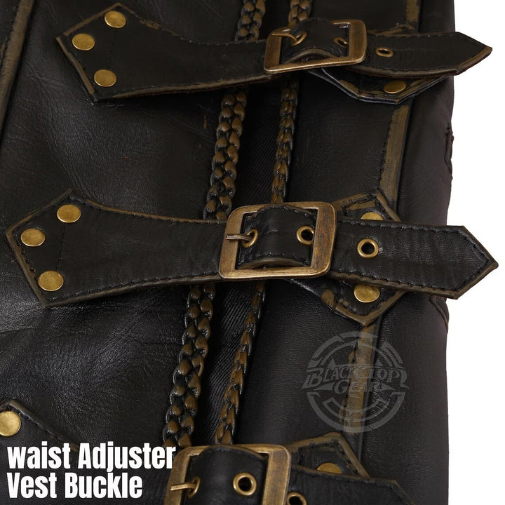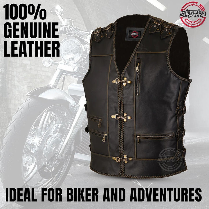 Men's Motorcycle Wax Braided Cowhide Leather Hook Clip Vest Motorbike Rider Vest