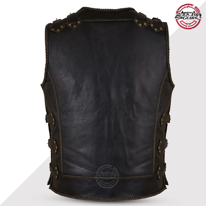 Men's Rider Premium Leather Motorcycle Vest with Brown Braiding and Clips