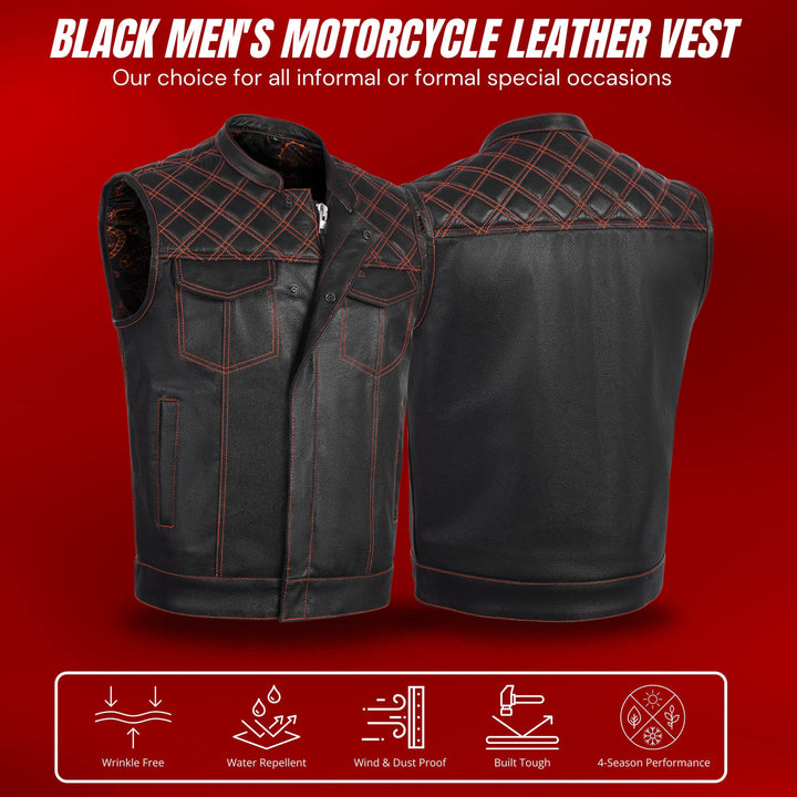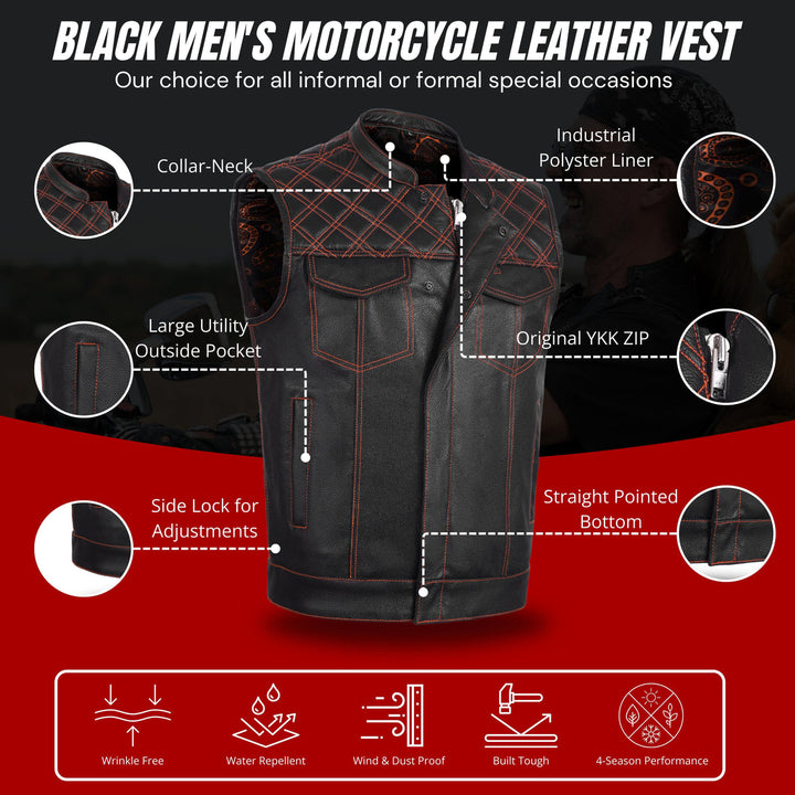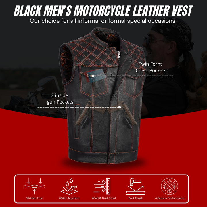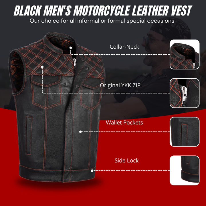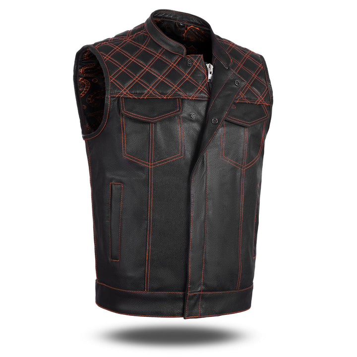 Blacktop Gear | Thunderbird - Men Orange Cross Stitch Club Cow Natural Leather Vest.