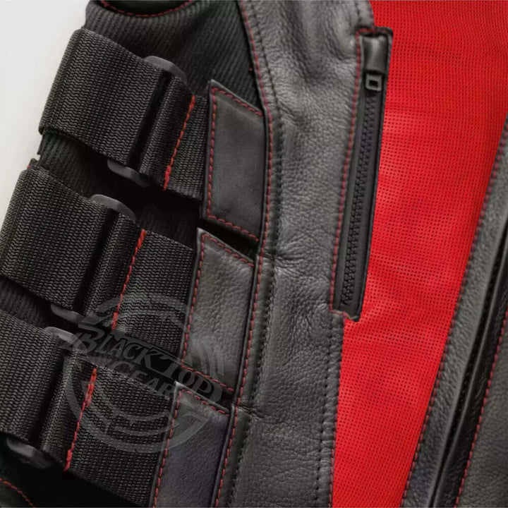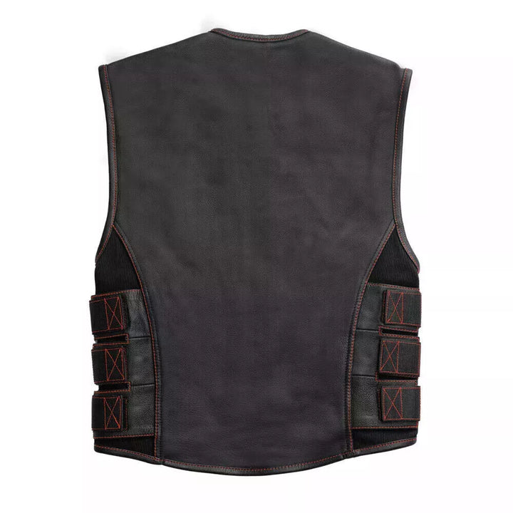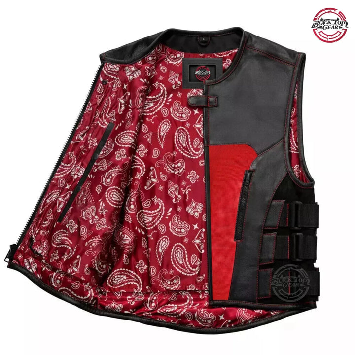 Men's SWAT Style Bike Black Vest Perforated Red Panel & Paisley Lining Waistcoat
