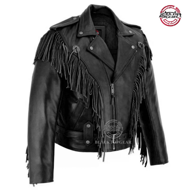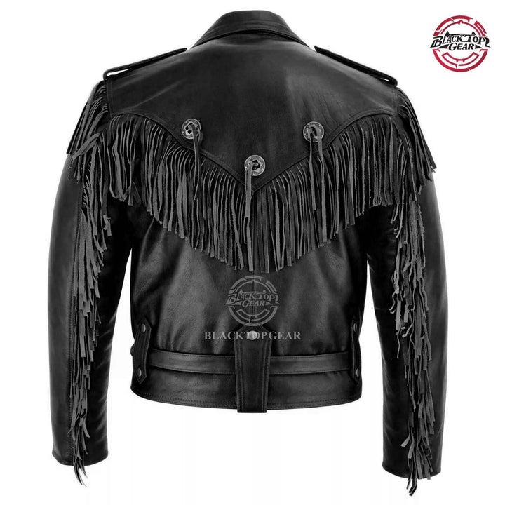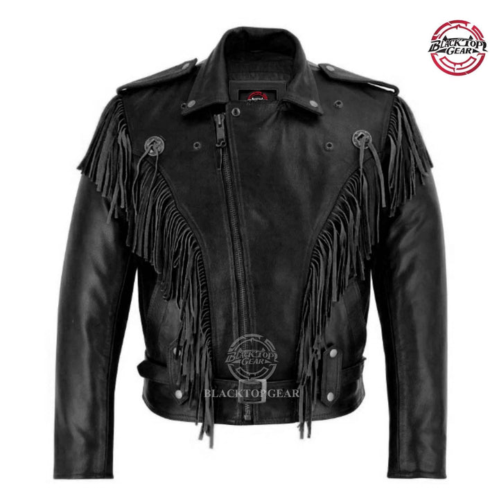 Step into the world of timeless Western flair with this BLACKTOP Men's Fringed Cowboy Biker Jacket. Crafted from genuine cowhide leather, this jacket blends rugged durability with stylish design, featuring bold fringes and a sleek, zip closure. Whether you're cruising the open road or making a statement in the city, this jacket is sure to turn heads.
